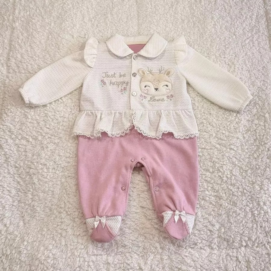 Os detalhes bordados e os babadinhos aplicados na gola enriquecem o design, trazendo um toque de delicadeza e sofisticação que destaca a identidade da Monede Baby. O pé fechado com laço decorativo, que simula um sapatinho, proporciona charme extra e mantém os pezinhos aquecidos com conforto.