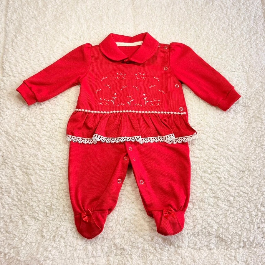 Em um tom vermelho vibrante, a peça ganha destaque com seus bordados florais delicados, que adicionam elegância ao visual, enquanto a gola clássica e os babados com renda na cintura reforçam o charme e a feminilidade do modelo. O pé fechado com laço, simulando pequenos sapatinhos, torna o look ainda mais completo e encantador.